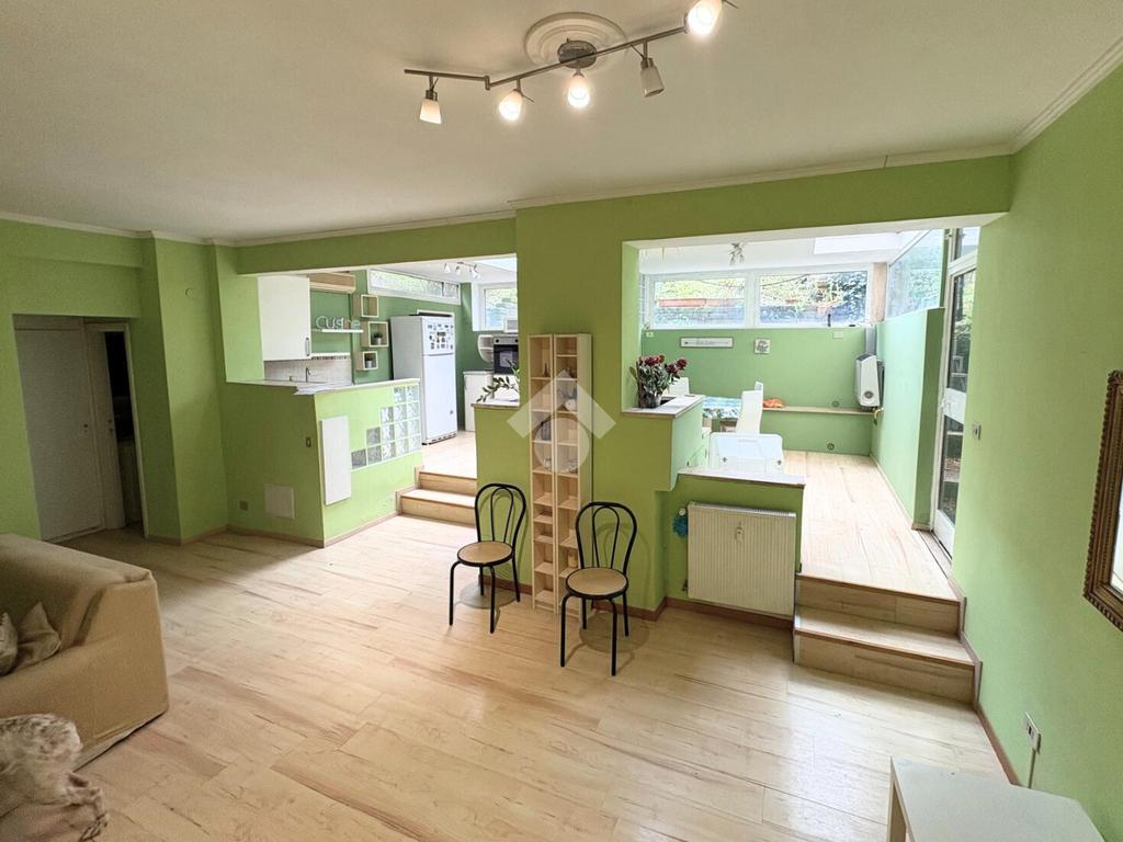 Internamente è così composto: ingresso, salone doppio con cucina a vista e sala da pranzo, due camere, doppi servizi entrambi con doccia, un ripostiglio, una dispensa ed ampio giardino di pertinenza comunicante con l'appartamento adiacente.