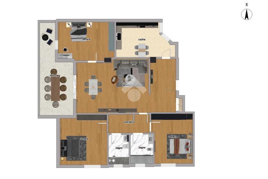 Internamente è così composto: ingresso, salone, cucina abitabile, disimpegno, tre camere, doppi servizi entrambi finestrati, uno con vasca e l'altro con doccia. Balcone vivibile.