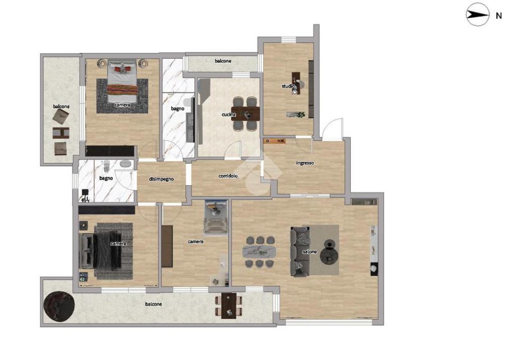 Internamente è così composto: ingresso, salone doppio con sala da pranzo, cucina abitabile, disimpegno, tre camere da letto, studio, doppi servizi entrambi finestrati di cui uno con doccia e l'altro con vasca, tre balconi.