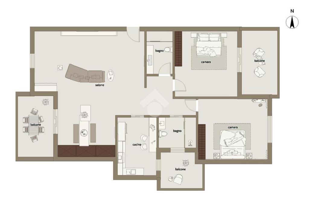 salone con camino e sala da pranzo, cucina semiabitabile, disimpegno, due camere matrimoniali, doppi servizi con doccia di cui uno finestrato e tre balconi con affaccio nel verde.