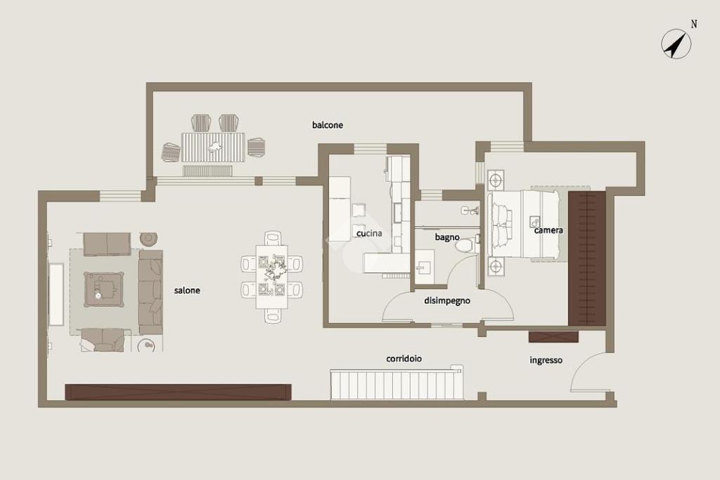 Al piano d'accesso troviamo: ampio ingresso, un corridoio che conduce al salone doppio con sala da pranzo, disimpegno, cucina abitabile, un primo servizio finestrato con doccia, una camera e un balcone vivibile.