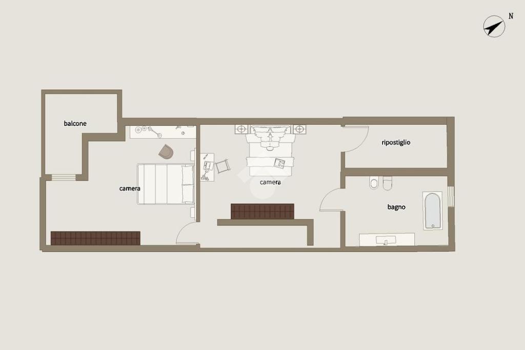 Il piano superiore, collegato da una scala interna, ospita due camere da letto, un secondo servizio en suite, anch'esso finestrato, con vasca, e un piccolo terrazzo.