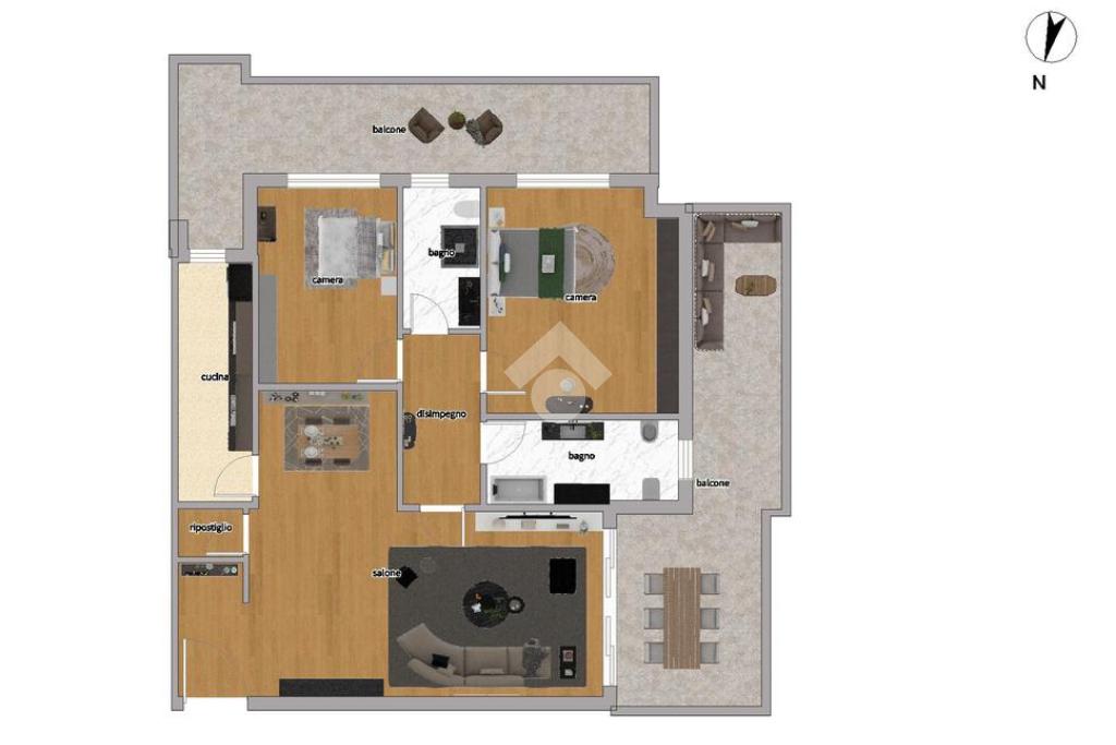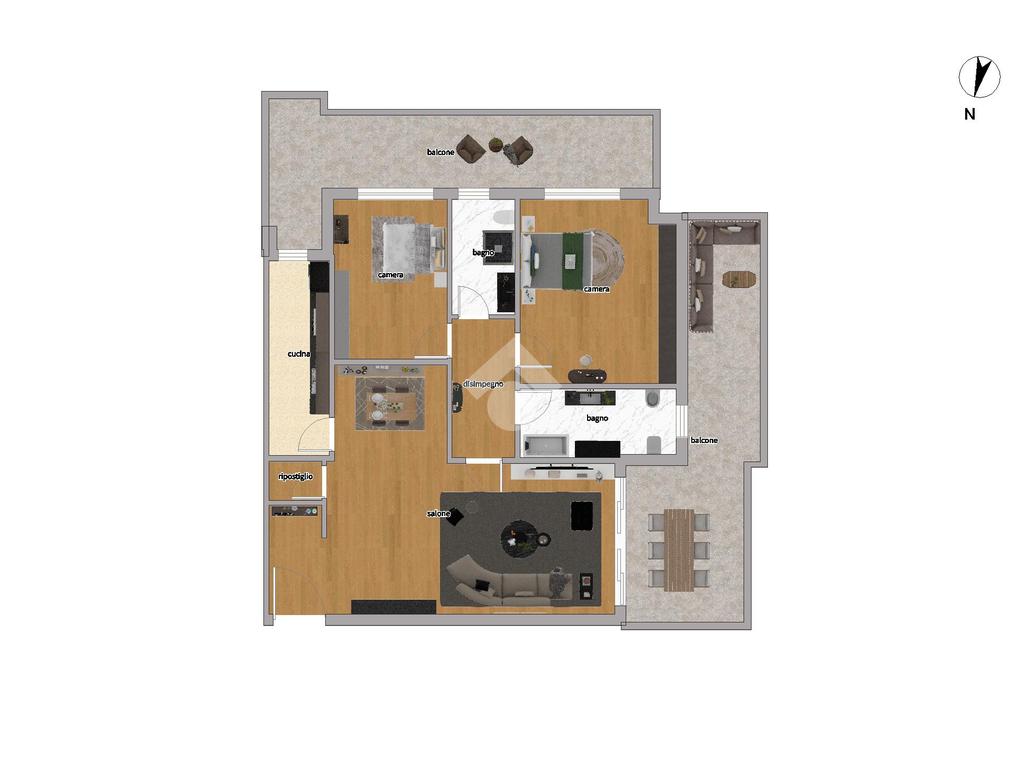 Internamente è così composto: ingresso, ampio salone, ripostiglio, cucina, disimpegno, due camere, doppi servizi entrambi finestrati, uno con vasca e l'altro con doccia, un balcone e un terrazzo.