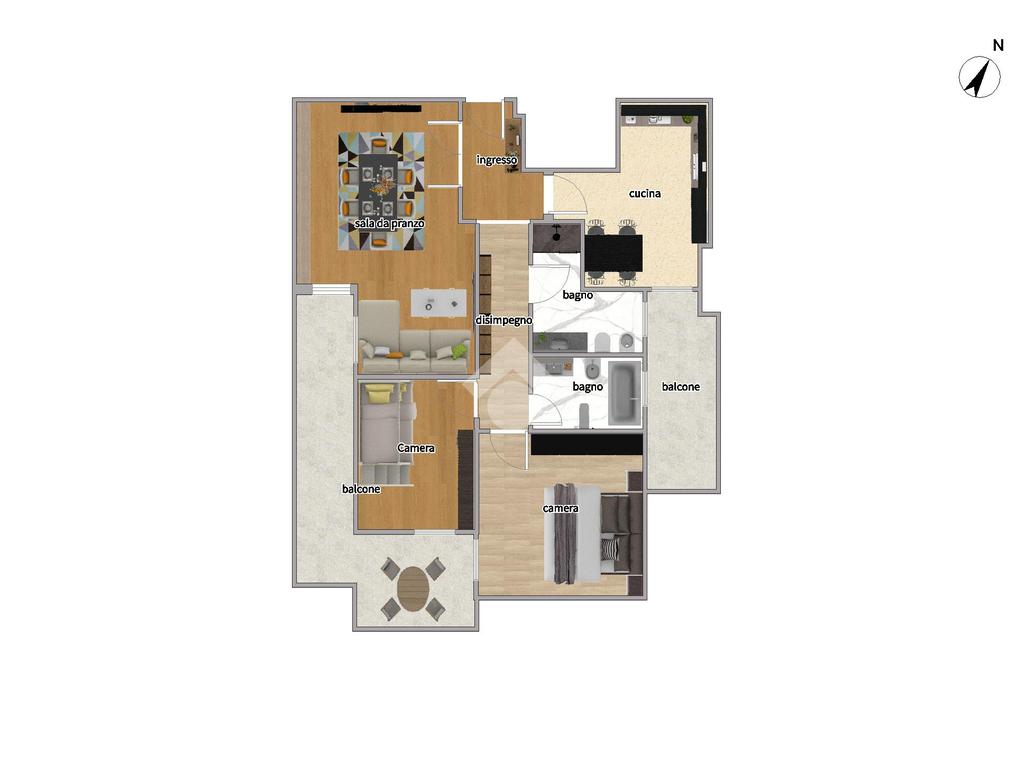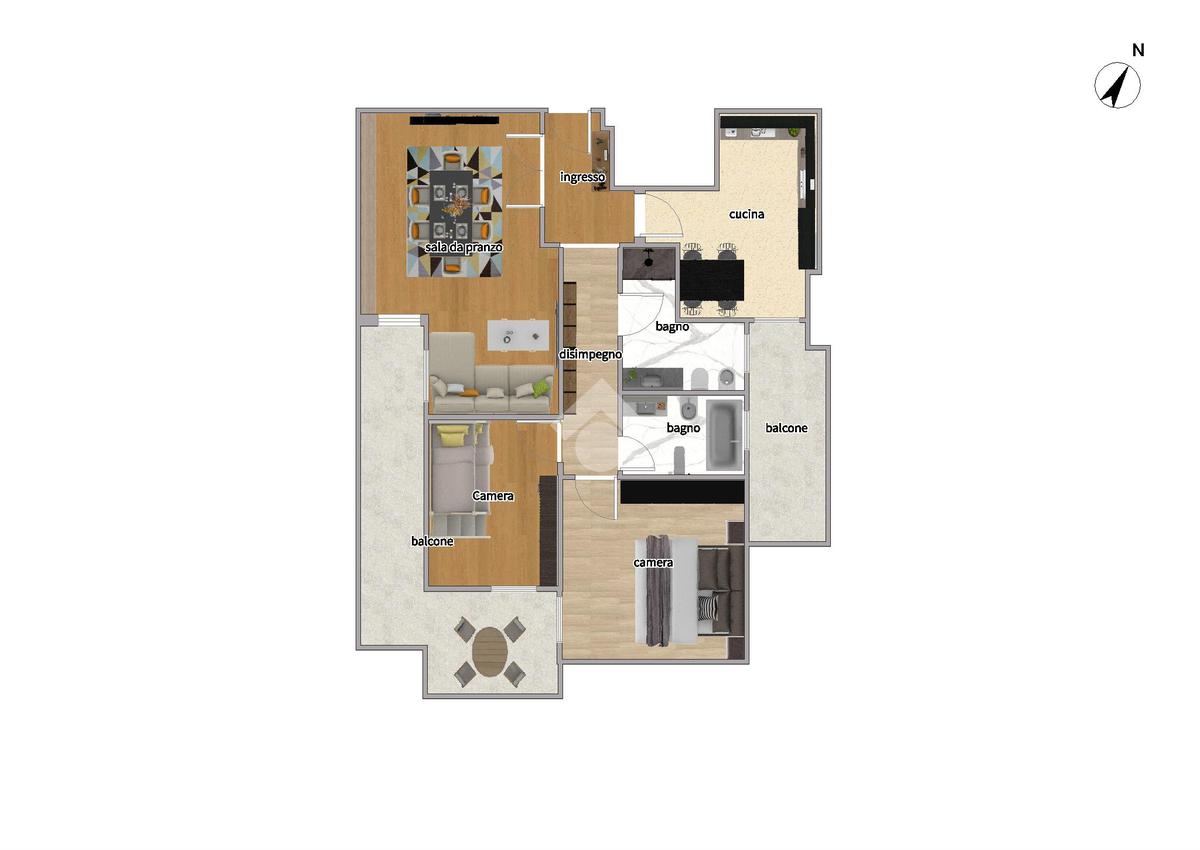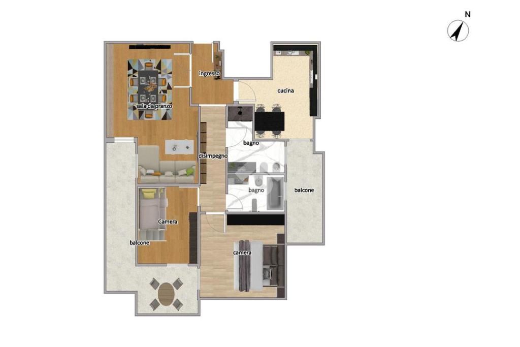 Internamente è così composto: ingresso, ampio salone, cucina abitabile, disimpegno, due camere da letto, doppi servizi entrambi finestrati, uno con vasca e l'altro con doccia, due balconi di cui uno comunicante con il salone e le due camere.