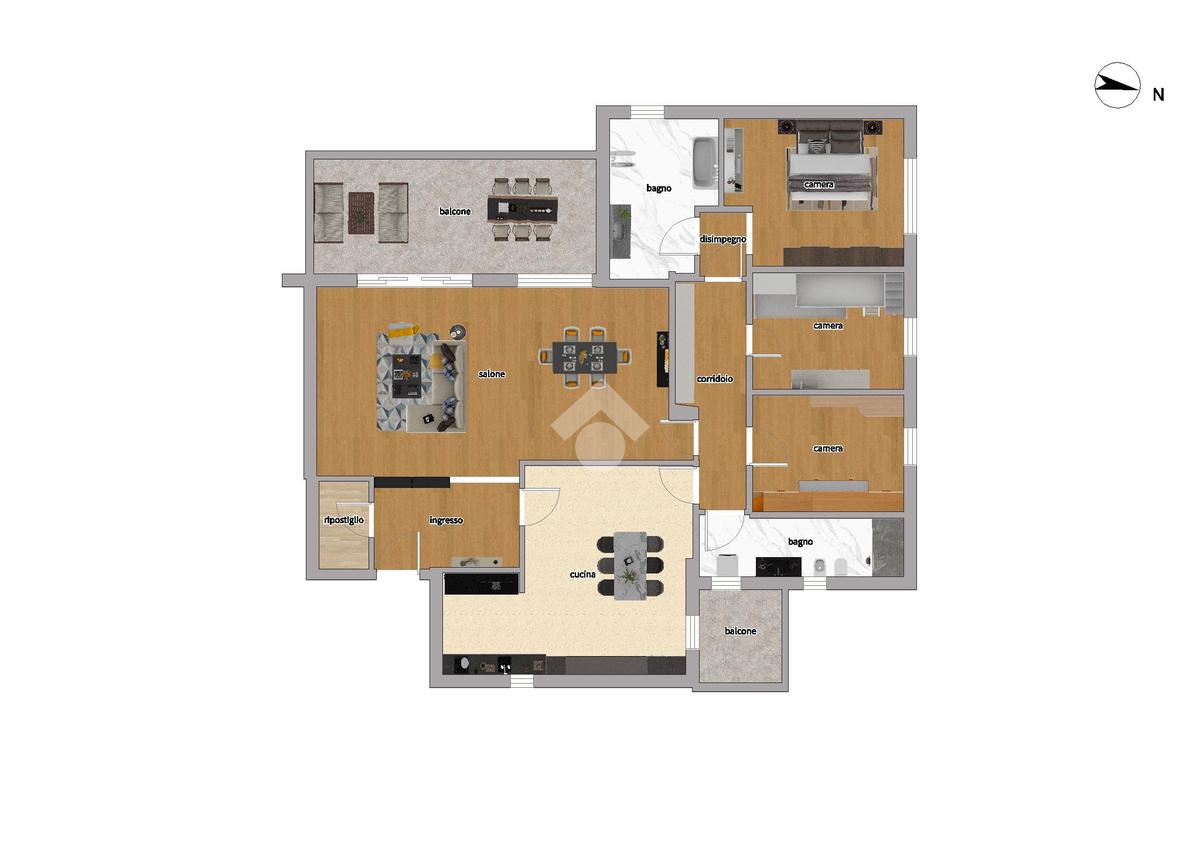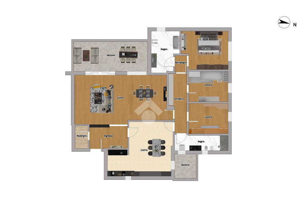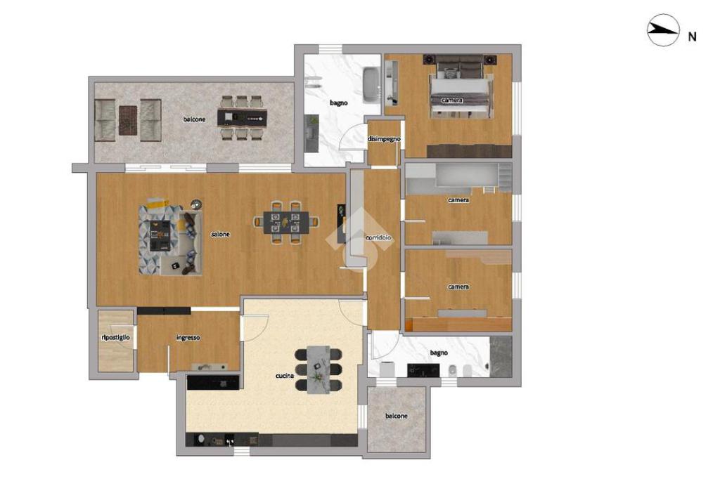 Internamente è così composto: ampio ingresso, ripostiglio, salone doppio, cucina abitabile con balcone di servizio, corridoio, disimpegno, tre camere da letto, doppi servizi entrambi finestrati, uno con doccia e l’altro con vasca.