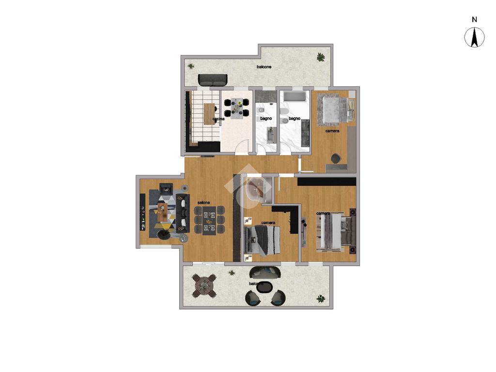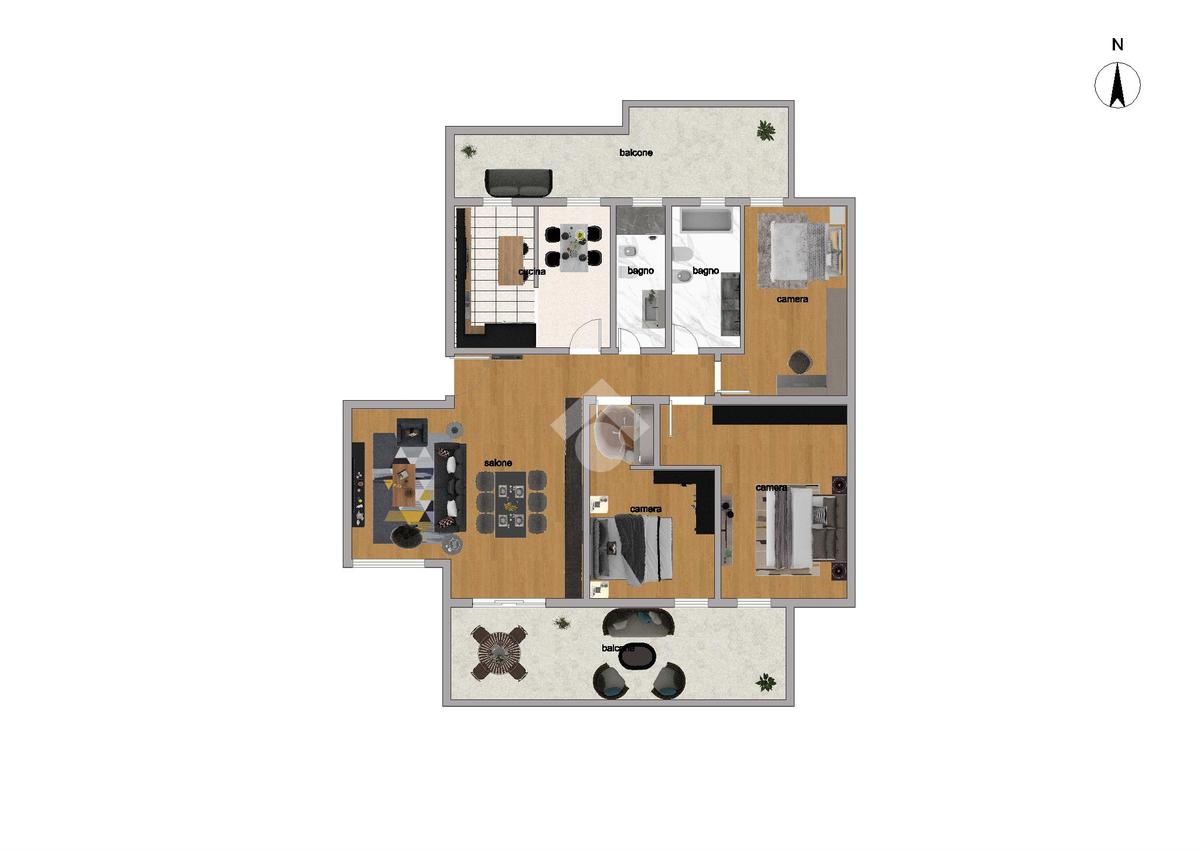L'appartamento gode di una doppia esposizione, in particolare lo spazio esterno accessibile sia dalla zona giorno sia dalle camere da letto, beneficia di una favorevole esposizione a Sud, ideale per godere di luce naturale costante e di un affaccio libero nel verde.